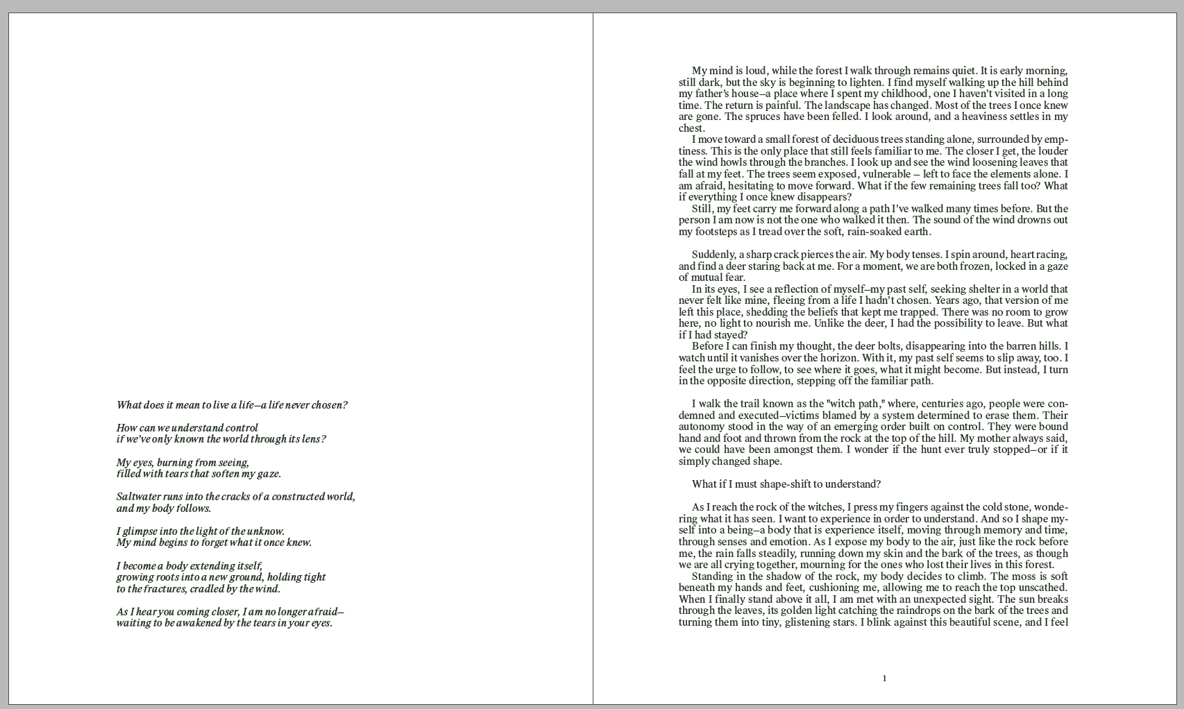 This project is a collaboration — with the forest that raised me, with deer sleeping in the gorse of the new grounds, with local hunters and rangers who shared their world. It holds the memory of the witches’ rock, the labor of my father, the quiet strength of my neurodivergent mother and sister.